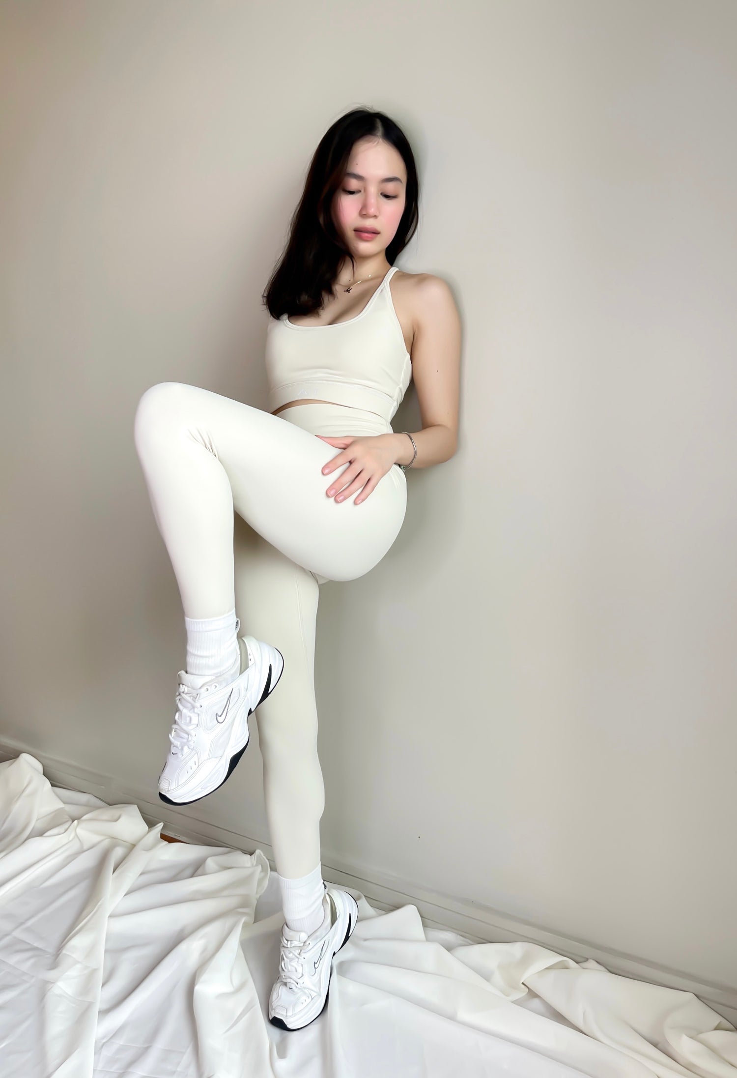 a high rise leggings coupled with a cropped sweetheart cut tank top...